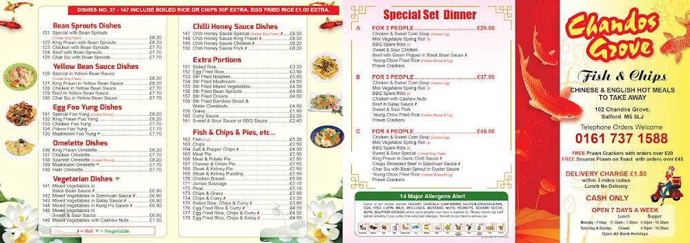 Nestled in Salford, Chandos Grove stands out as a beloved local spot for both Chinese and British cuisine. The restaurant's location makes it easily accessible for many residents and those exploring the area. The cozy atmosphere invites visits any day of the week, from lunch to late-night munchies. Chippy lovers rave about the crispy fish and chips, while fans of Chinese fare can't get enough of the chow mein and sweet and sour dishes.